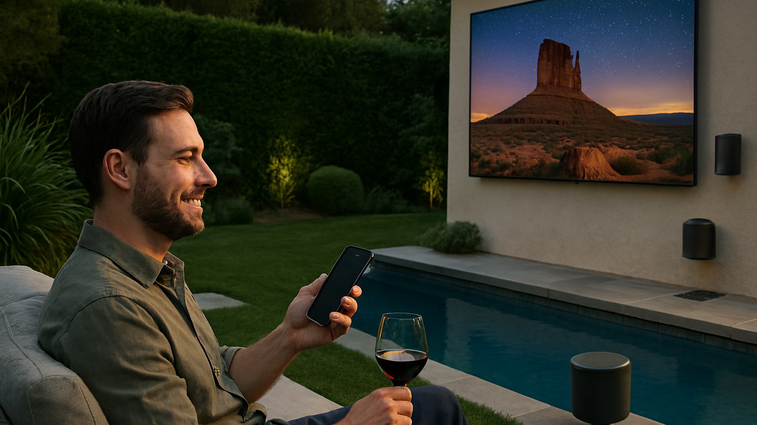 An elevated outdoor entertainment experience. Enjoy your favorite movies, shows, or music in your garden, terrace, or pool area with discreet, high-quality equipment you can control from your smartphone or with voice commands.